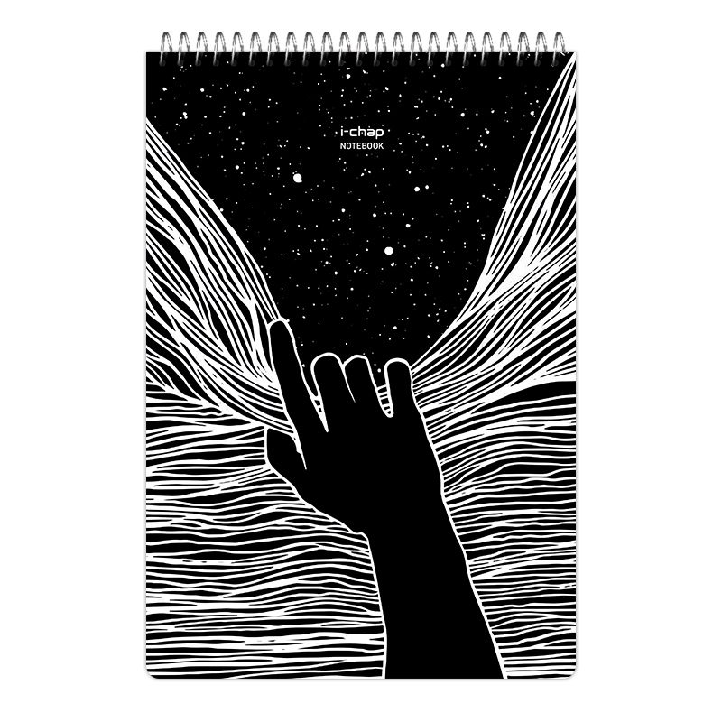 داخلش کاغذ ۸۰ گرم با چاپ دوطرفه شطرنجی هست، با مربع‌های ۵ میلی‌متری دقیق و رنگ خاکستری کمرنگ که هم چشم رو اذیت نمی‌کنه و هم نوشته‌هات قشنگ دیده می‌شه.